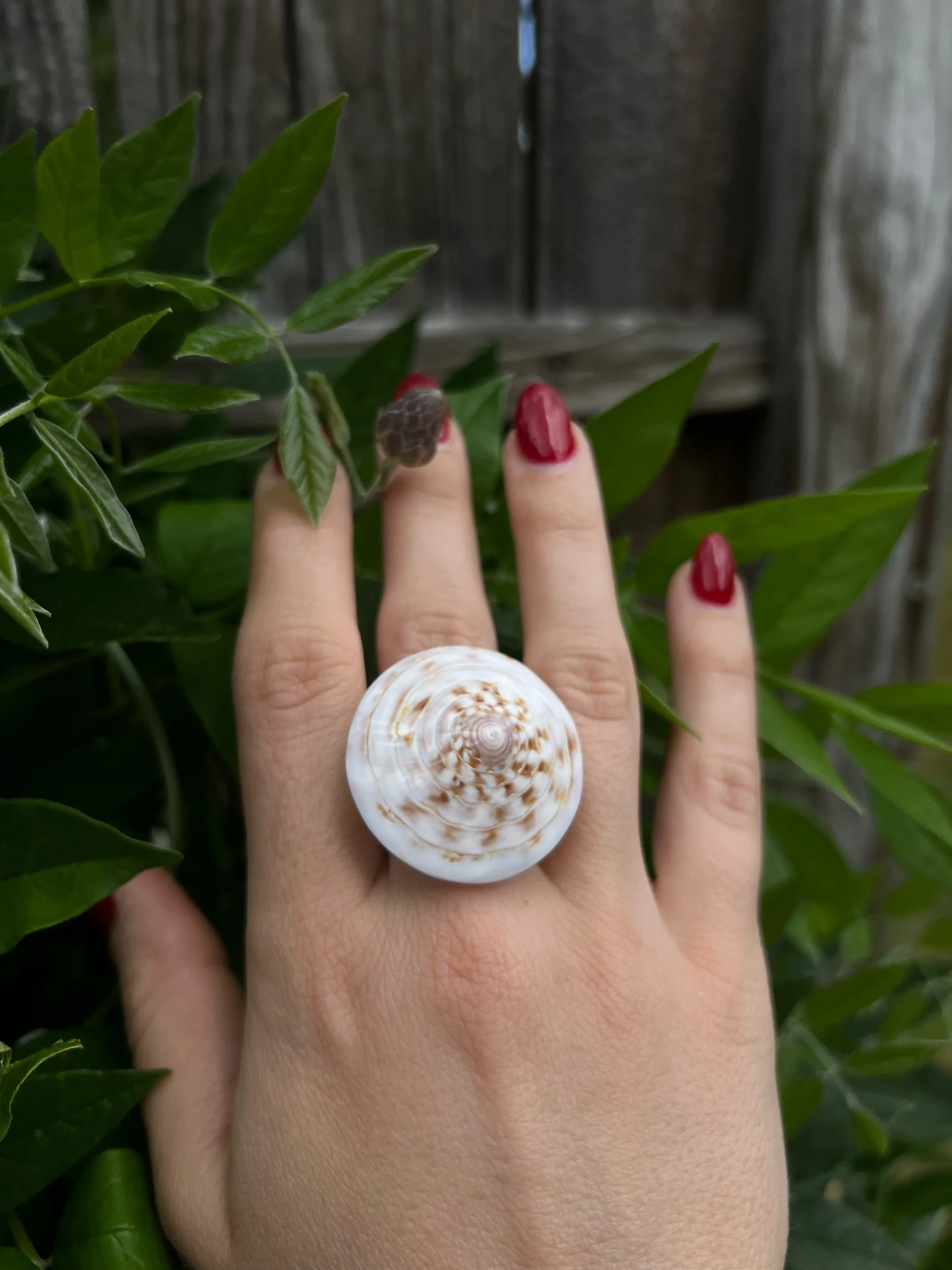shop › Top Swirl Shell Ring Image 1 of 1 Top Swirl Shell Ring $16.00 Size: Small Large Add To Cart Added! Hand-carved from natural shell. Sizing is approximate. Hand-carved from natural shell. Sizing is approximate. You Might Also Like Quick View Natural Shell Ring, Light Brown Quick View Nesting Doll Pouch Quick View Classic Hair Fork Quick View Natural Swirl Shell Ring Quick View Rosette Scrunchie